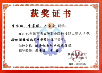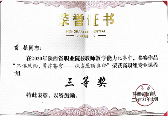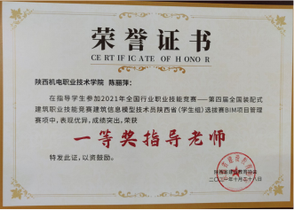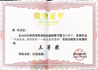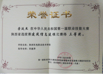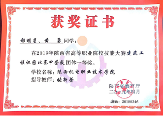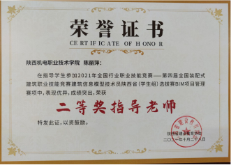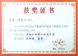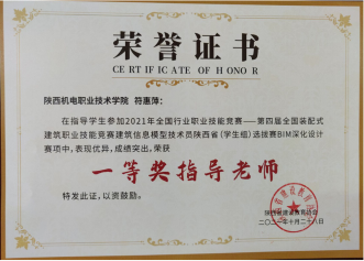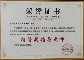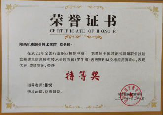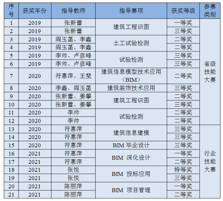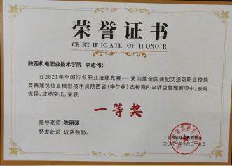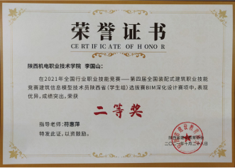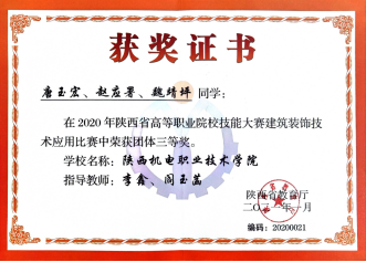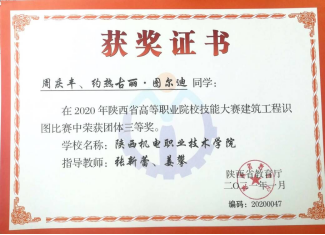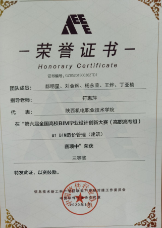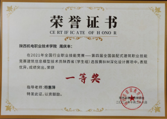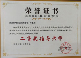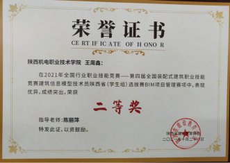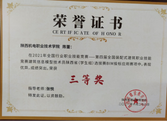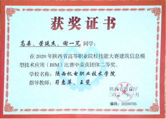 因为日常将BIM教学融入专业课,员工对于BIM技术的了解较多,参加各类技能大赛比较积极。在2020年陕西省高职院校技能大赛建筑信息模型(BIM)应用技术赛项中,员工获得二等奖第一名的好成绩。在全国第一届技能大赛陕西选拔赛建筑信息模型(BIM)赛项中,获得三等奖二个。(见附录11)