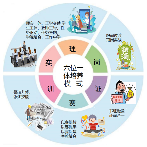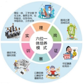 六位一体的培养模式,以提高人才培养质量为中心,通过这六个方面互相渗透,互相融合,实现培养真正适合市场需求的专业技能人才的目标。
