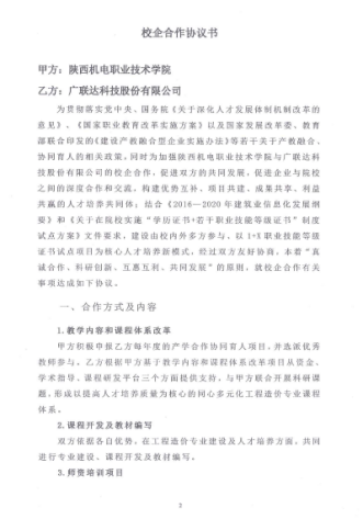 2.2015年与广联达股份有限公司签订校企合作协议,探索和实践了“校企协同育人 共建实训基地”的专业建设思路。