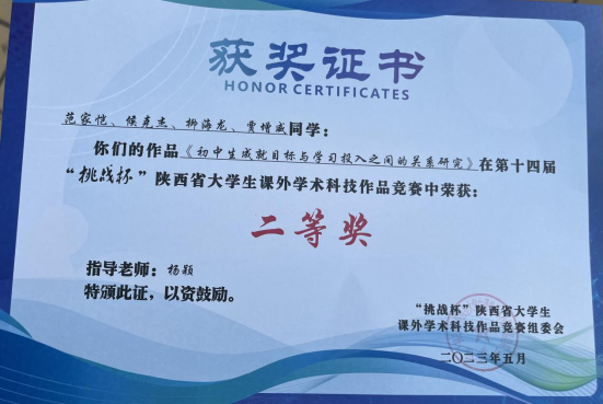 最终,在杨颖老师的指导下,公司22铁道信号2班范家恺担任团队负责人,22铁道信号2班侯克杰、22铁道运管1班柳海龙、21铁道信号2班贾增威参与的学术作品“初中生成就目标与学习投入之间的关系研究”成功在本次挑战杯中夺得省级二等奖。