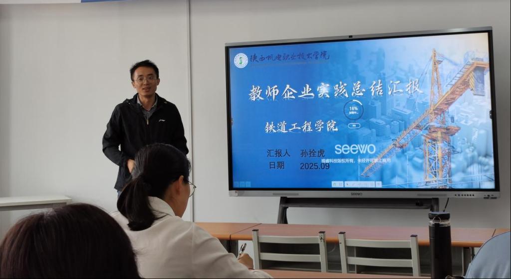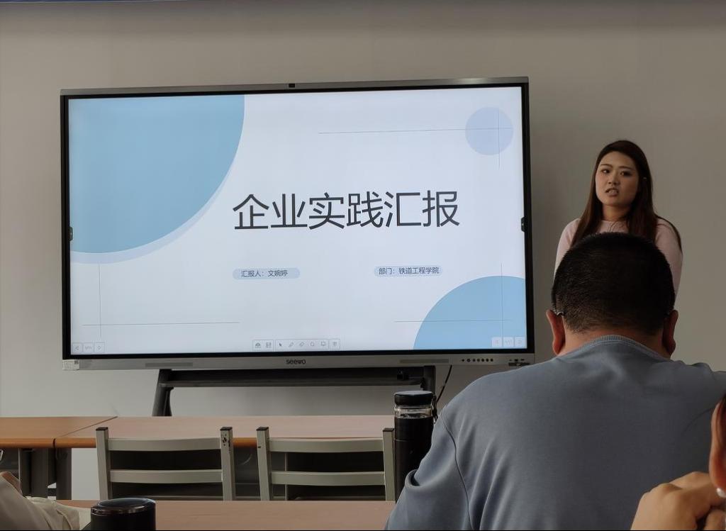 此次汇报人员涵盖2025 年暑期参加企业实践的 12 位教师,他们分别在陕西国铁集团西安铁路科创轨道交通技术开发有限公司、陕西交控市政道路建设有限公司、中高铁电气化装备股份有限公司等多家企业,参与了涵盖土建、铁道等专业实践内容。