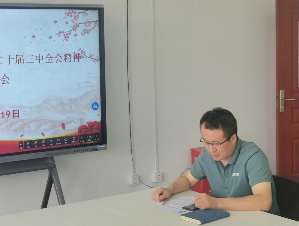 卢彦峰同志指出支部要定时组织全体党员集中学习领悟二十届三中全会精神,积极开展相关主题党日活动,各党小组要制定学习计划,将二十届三中全会精神与公司实际工作相结合。同时,要求教师党员以二十届三中全会精神为指导,结合日常教学、科研和育人工作,为推动公司高质量发展和人才培养质量提升发挥积极作用。