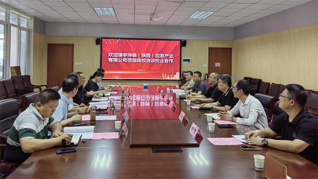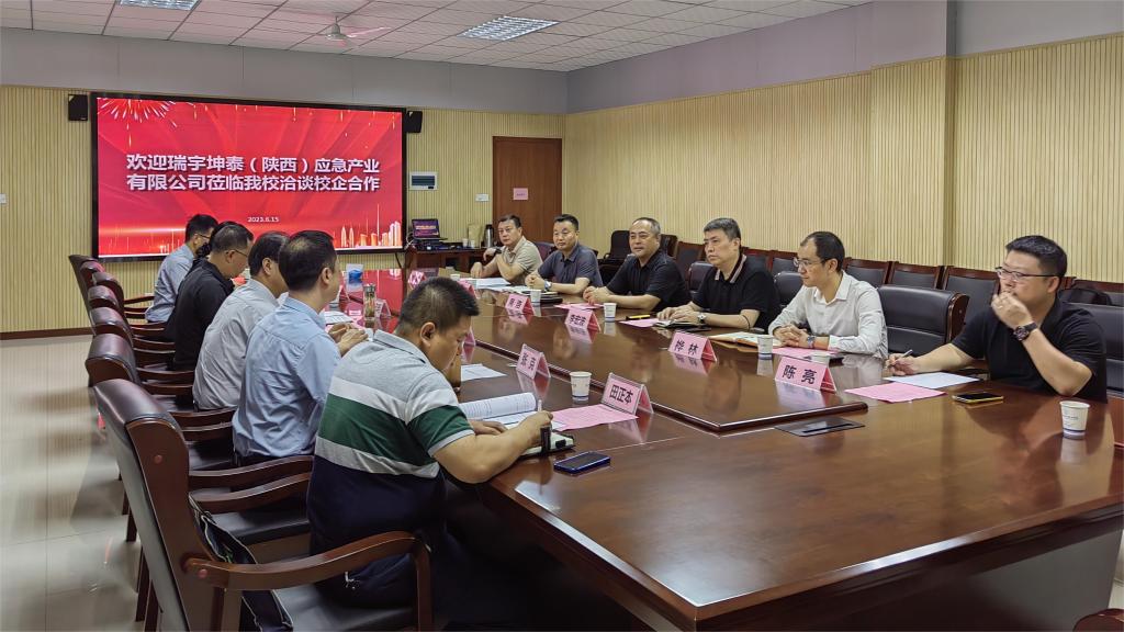 为推动产学研协同创新,寻求校企合作共赢、共谋发展的良好局面,深化产教融合发展,促进高素质应用型人才培养。2023年6月15日,瑞宇坤泰(陕西)应急产业有限公司董事长周浩一行7人莅临公司洽谈校企合作事宜。党委书记伊逊智,党委副书记、经理向纪明,党委副书记、纪委书记陈红梅,党委委员、副经理张克等接待了周浩一行,并举行会议。会议由副经理张克主持。