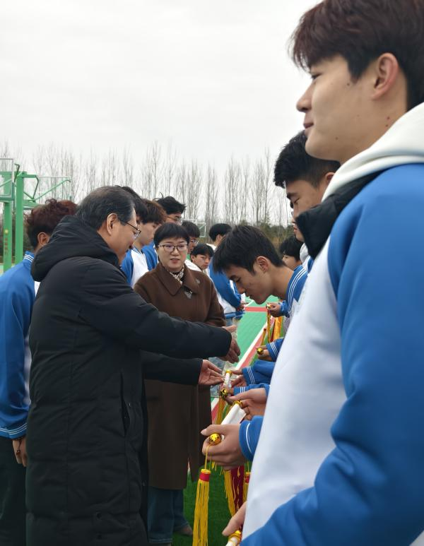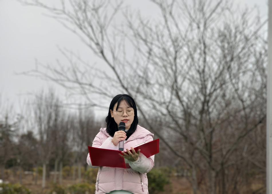 伴随着激昂的音乐,升国旗仪式正式拉开帷幕。第一项议程是出旗仪式。本次升国旗的擎旗手由24铁道工程管理专业的王荣同学担任,他步伐矫健有力,护送鲜艳的五星红旗迈向旗杆,尽显新时代青年的飒爽英姿与坚定信念。护旗手24机电技术1班的高宵博和24机电技术9班的杨立紧跟其后,身姿挺拔、神情肃穆,为升旗仪式增添了庄重神圣之感。指挥手由24铁道工程4班的赵鹏和24建筑消防2班的赵甜甜共同担任,他们手势精准、指挥有力,引领全场师生齐声高唱国歌,激昂的旋律在校园上空久久回荡,点燃了每个人心中的爱国热情与民族自豪感 。