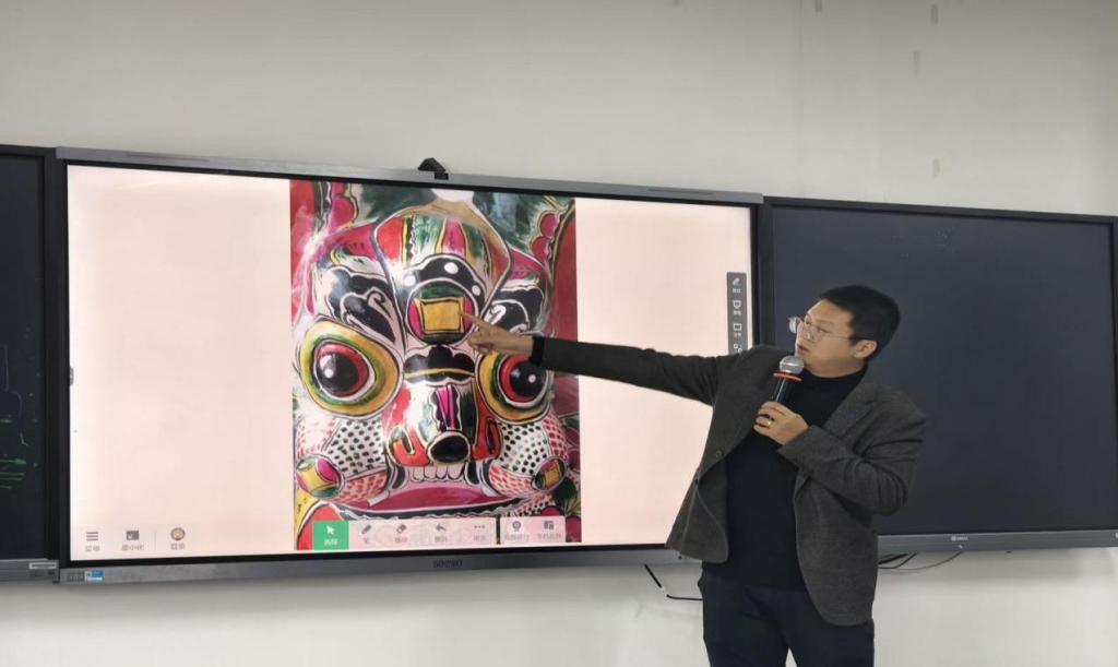 在核心“美学解码”环节,韩建斌围绕凤翔泥塑的色彩、造型与纹样三大核心要素展开深度解读。他指出,凤翔泥塑以“大红大绿显吉祥”的色彩搭配传递民俗情感,以“夸张变形见童趣”的造型语言塑造经典形象,其“鱼戏莲”“虎镇宅”等传统纹样更是蕴含着劳动人民对美好生活的向往。为让理论更易理解,韩建斌展示了多件凤翔泥塑精品,从“坐虎”的威武姿态到“挂虎”的灵动纹样,逐一剖析其中的美学逻与文化寓意,引发师生阵阵惊叹。