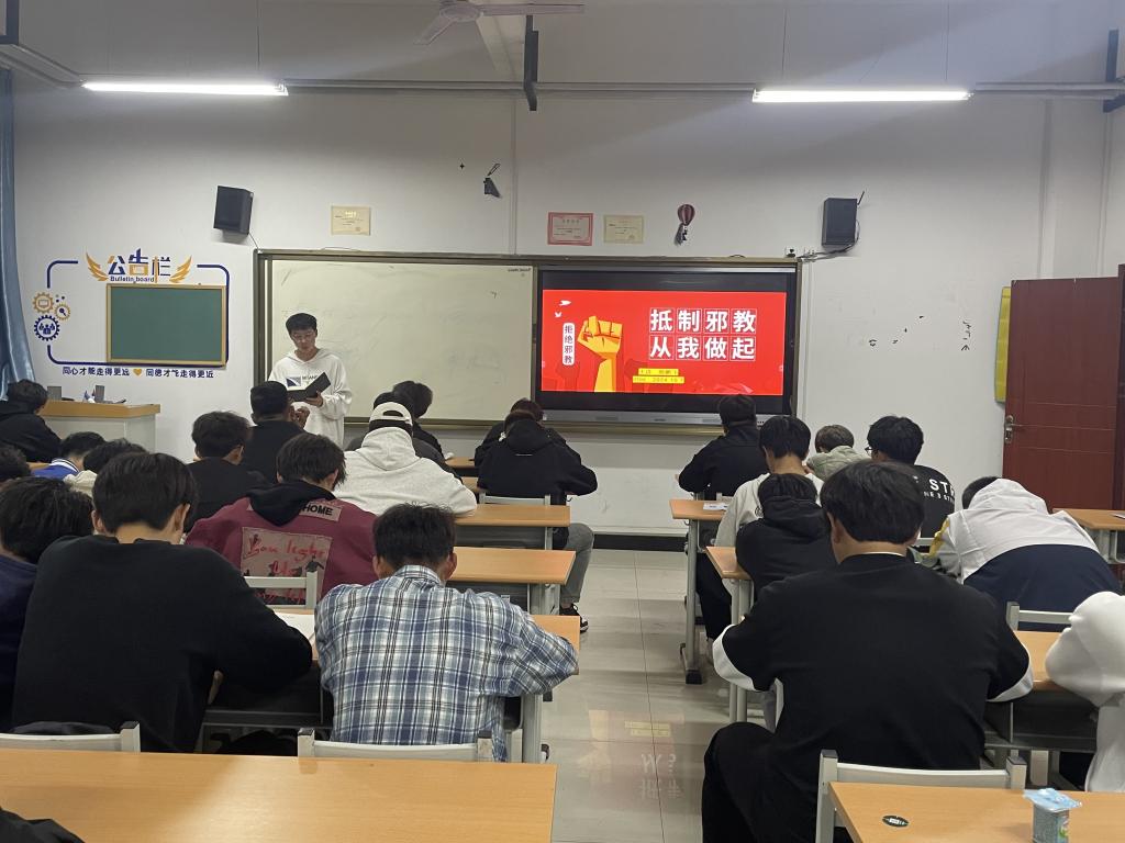 班会伊始,班主任老师通过图文、视频等多种形式带领员工直观地了解邪教、感受邪教的危害。随后详细讲解了邪教的定义、特征以及常见的种类和分布。通过列举“法轮功”、“全能神”等邪教案例,深入浅出地剖析了邪教的欺骗性和危害性,让同学们对邪教有了更加清晰的认识。