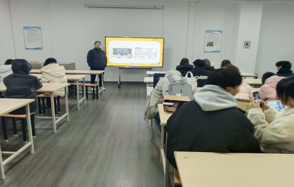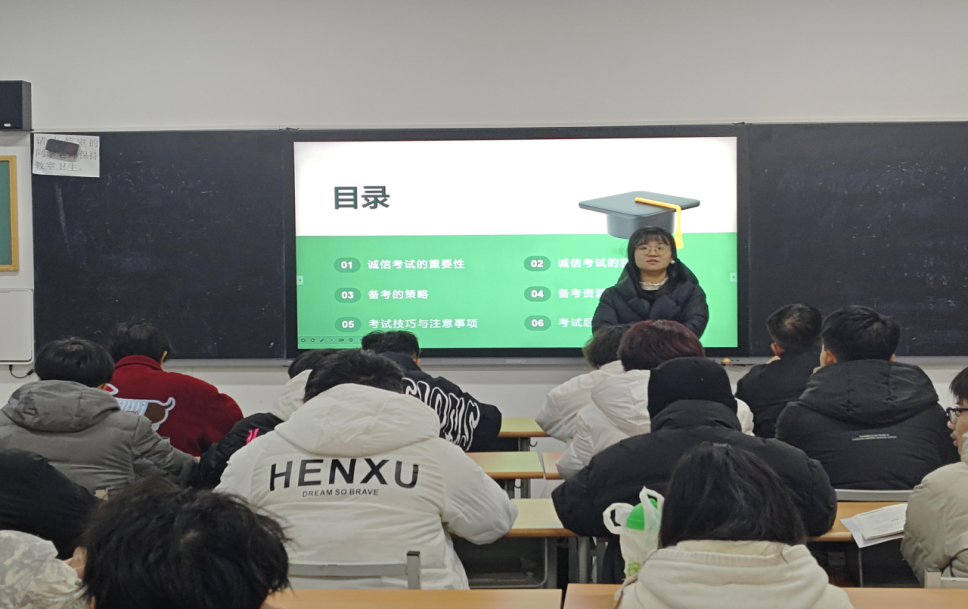 各班级辅导员/班主任首先介绍了诚信的意义。其次,与同学们深入讨论备考中遇到的困难和挑战,以及如何克服这些困难。通过生动的案例分析和互动讨论,让同学们学习如何合理安排学习时间,提高学习效率,避免临时抱佛脚。通过掌握有效的学习方法,如主动学习、合作学习等,以提高学习效果。同时也学会了如何在备考期间管理压力和焦虑,保持心理健康。